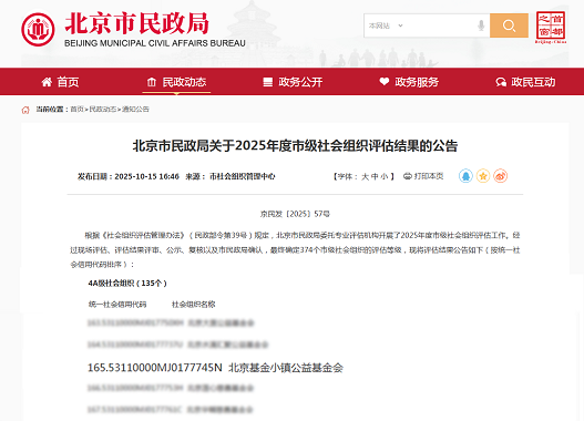 The Beijing Municipal Civil Affairs Bureau has recently published the Announcement on the 2025 Municipal-Level Social Organization Evaluation Results on its official website. Following a rigorous evaluation process conducted in accordance with the "Social Organization Evaluation Management Measures" (Ministry of Civil Affairs Order No. 39), the Beijing Fund Town Foundation has been accredited as a 4A-Grade social organization. The process included on-site assessment by professional assessment institutions, expert review, public notice, review and verification (recheck), and final confirmation by the Bureau.